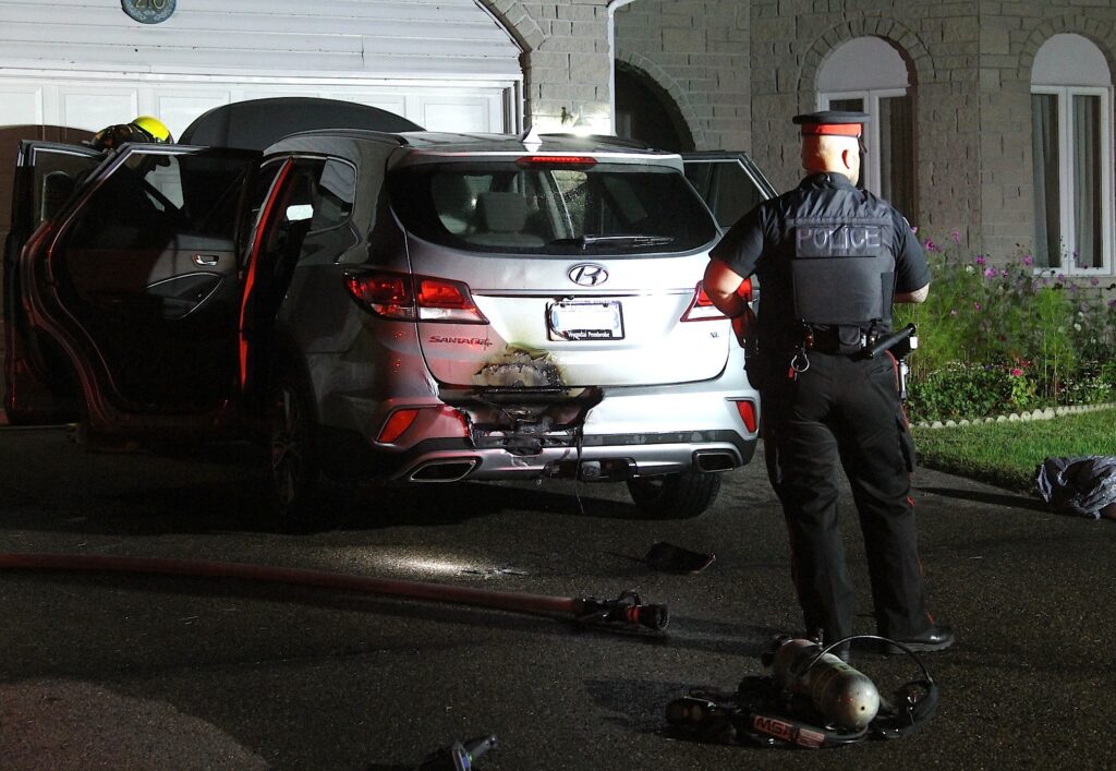 Firefighters were called out to the scene just before 9:30 pm. The homeowners had parked their Hyundai SUV in the driveway and were warned by a passer-by that the rear of the vehicle was on fire about 10 minutes after arriving home.